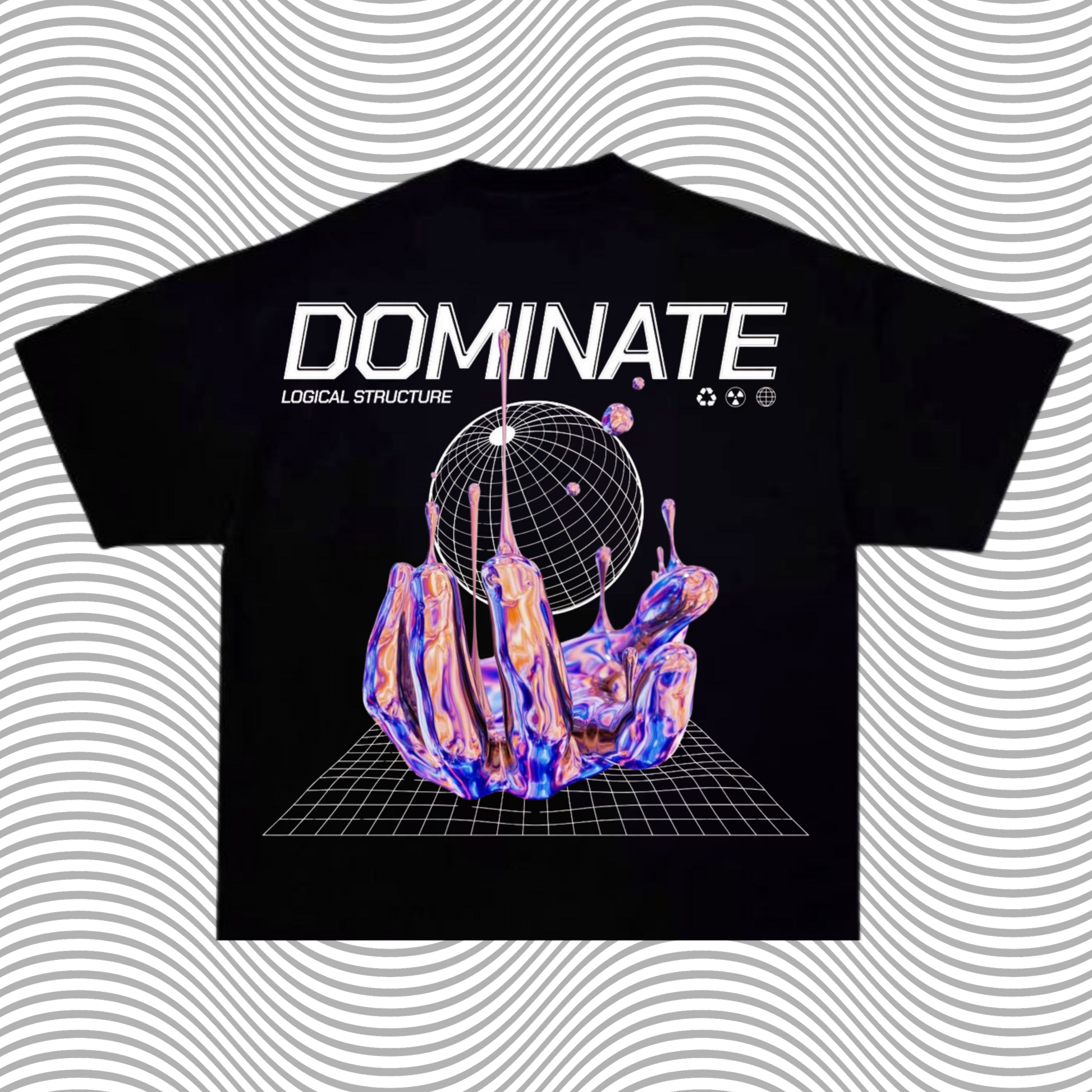 Make a statement with The 'Dominate Glitch' Oversized Standard Tee, where bold typography meets futuristic design. The front features the commanding word "DOMINATE" while the back showcases an intricate cyberpunk graphic—glowing, distorted hands grasping a virtual sphere on a wireframe grid—symbolizing control over both digital and physical realms. Crafted from premium 100% pure cotton at 180 GSM, this tee delivers exceptional softness and breathability with a structured drape that maintains its sharp silhouette. The unisex oversized cut includes extended length and dropped sleeves for an effortlessly refined aesthetic. Available in striking black, this piece merges motivational messaging with contemporary street style. Care: wash inside-out in cold water, tumble dry low, and iron inside-out to preserve the graphic integrity.