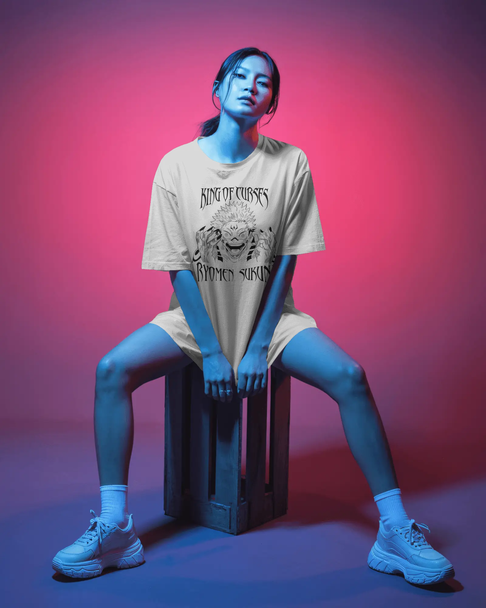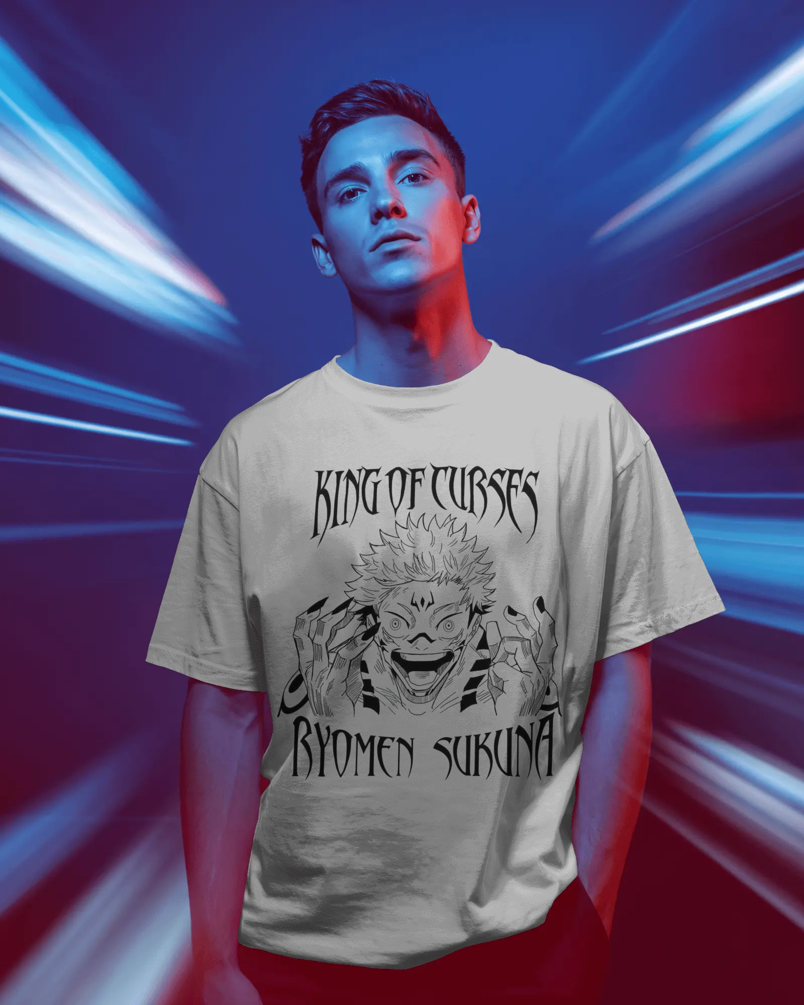 Ryomen Sukuna Domain Expansion Crew – a premium oversized tee celebrating the King of Curses from Jujutsu Kaisen. Crafted from 100% pure cotton (180 GSM) for a soft, structured drape that holds its shape. Features a striking black-and-white graphic of Sukuna's menacing visage across the chest. The unisex oversized silhouette delivers extra length and sleeve drop for effortless style. Available in crisp white. Perfect for anime enthusiasts seeking bold, wearable art with premium comfort.