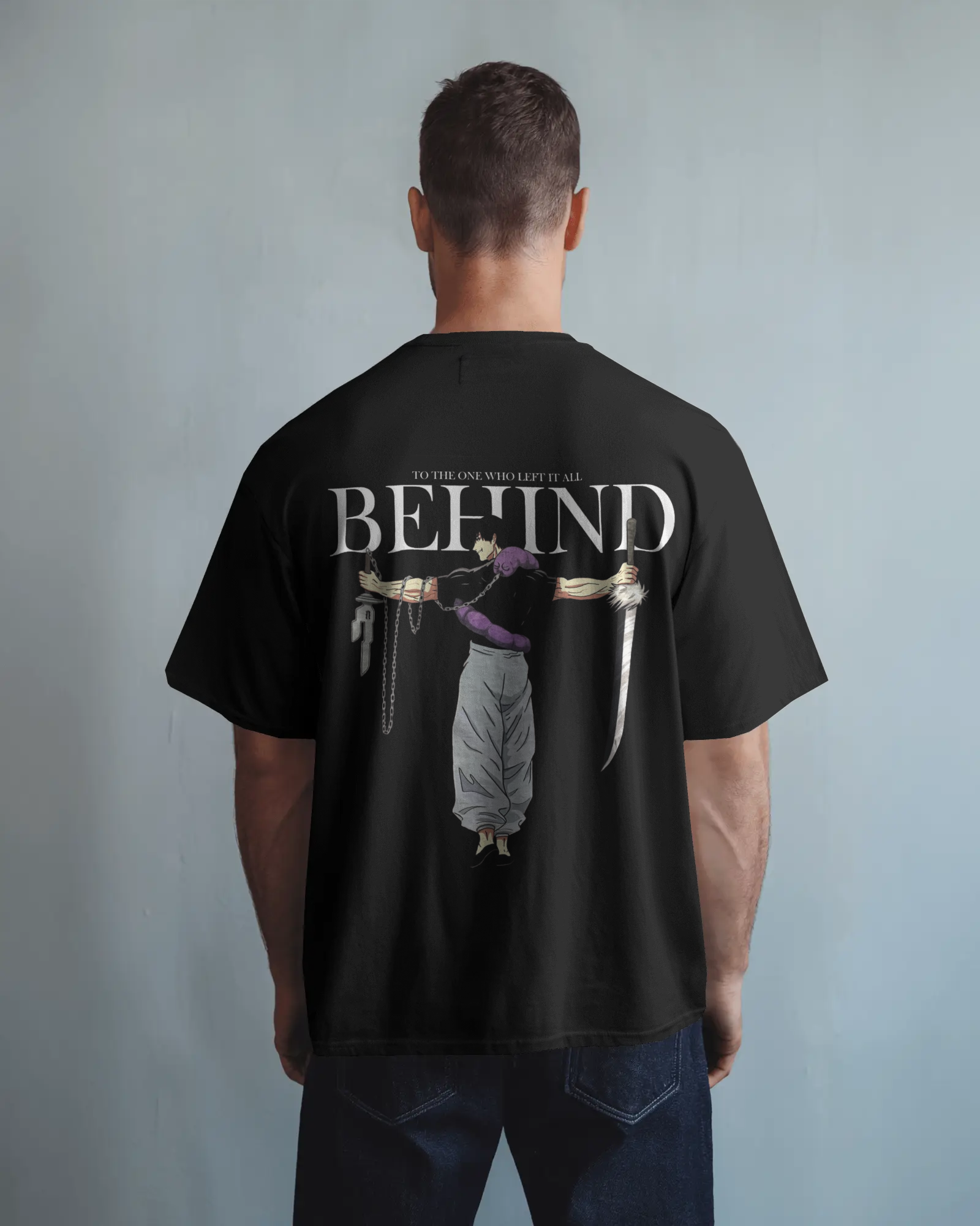Toji Fushiguro commands respect in this oversized tee, featuring a bold graphic of the Sorcerer Killer with the iconic "BEHIND" text. Crafted from 100% pure cotton at 180 GSM, it delivers a soft, breathable feel with structured drape and a sharp silhouette. The unisex oversized fit offers extra length and sleeve drop for effortless style. Perfect for JJK fans who value premium comfort and striking design.